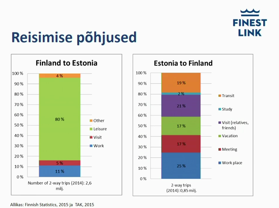 Võiks arvata, et soomlased tulevad Eestisse turismi (ja ilmselt alkoholi ostmise) eesmärgil ning et eestlased käivad Soomes tööl ja nädalavahetuseks Eestis pere juures (ja võib-olla samuti odavat alkoholi ostmas). Tegelikult on põhjused mitmekesisemad: soomlased käivad küll Eestis peamiselt lõbu pärast, aga eestlased käivad Soomes tööl, koosolekutel, puhkamas, sõpradel/sugulastel külas ja edasireisimiseks1: