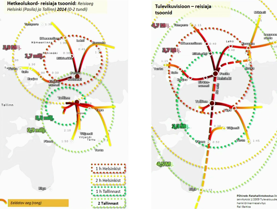Vasakpoolne allolev joonis näitab, kui palju inimesi elab praegu 1h ja 2h kaugusel Helsingist ja Tallinnast; parempoolne joonis näitab sama asja tingimusel, et olemas on pooletunnine rongiühendus lahe alt. Linnade ühendamine annaks Tallinnale juurde üle miljoni inimese, kes on kuni tunniajase rongisõidu kaugusel (see on veel aktsepteeritav commute’i pikkus) ja neli miljonit inimest, kes on kahe tunni kaugusel.