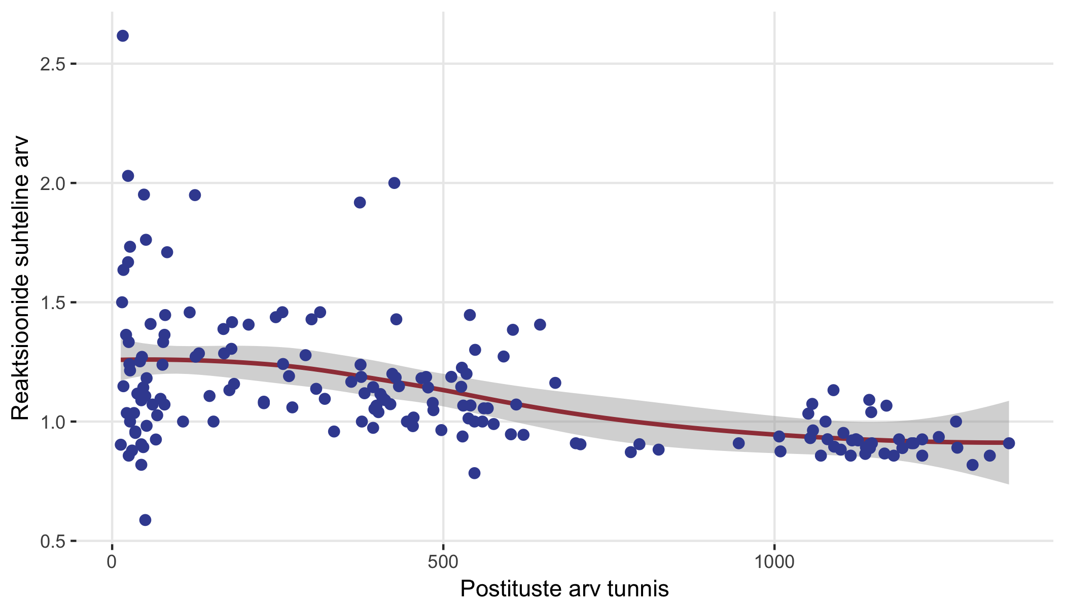 Tundub, et hõredamatel aegadel postitatu on keskmiselt populaarsem. Üks võimalik põhjus on saturatsioon: aegadel, kus kõik postitavad, ei ole sinu kirjutatul võimalust löögile saada ja seetõttu reaktsioonide arv väheneb. Vaatame seda: järgneval graafikul on iga punkt üks tund nädala sees (näiteks kl 14-15 esmaspäeviti) ja näeme reaktsioonide suhtelise arvu sõltuvust sellest, kui palju postitusi sel ajal tehti: