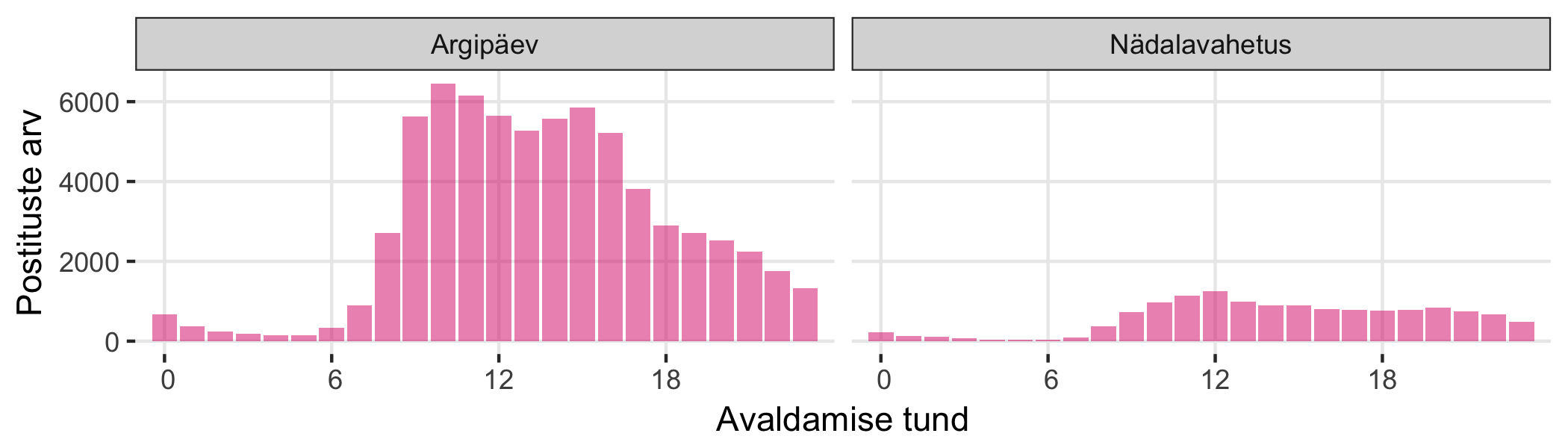 Vaatame, kuidas sõltub postituste arv nädalapäevast ja kellaajast. Avaldamise kellaaeg on ümardatud alla, seega nii 14:05 kui 14:59-st ümardatakse 14-ks.