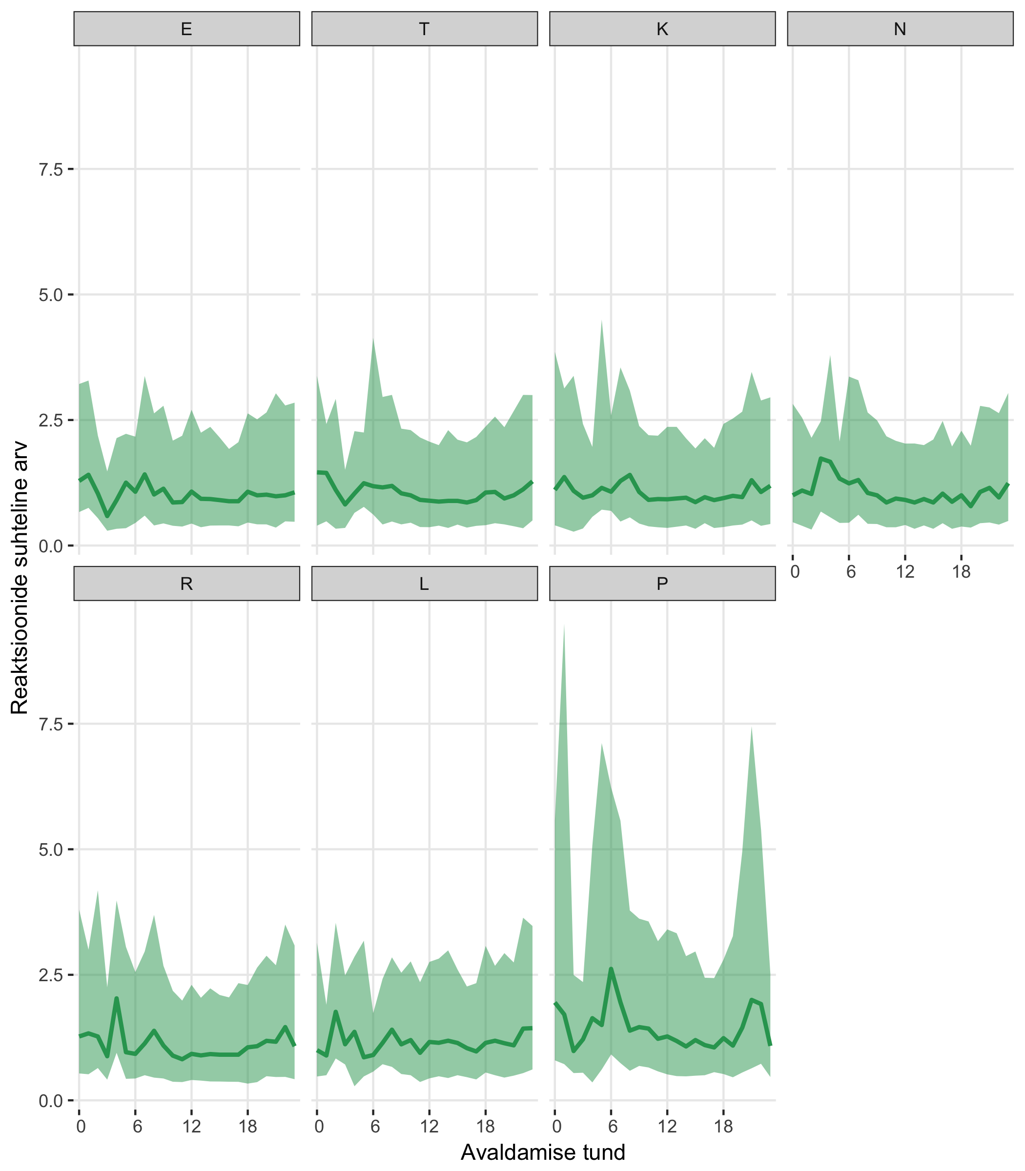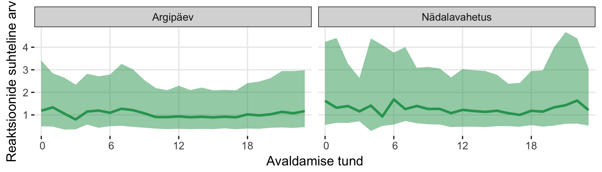 Graafiku roheline joon näitab reaktsioonide suhtelise arvu mediaani ja heleroheline piirkond näitab 25% ja 75% kvantiile.